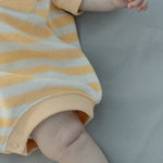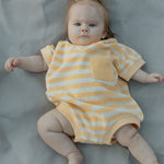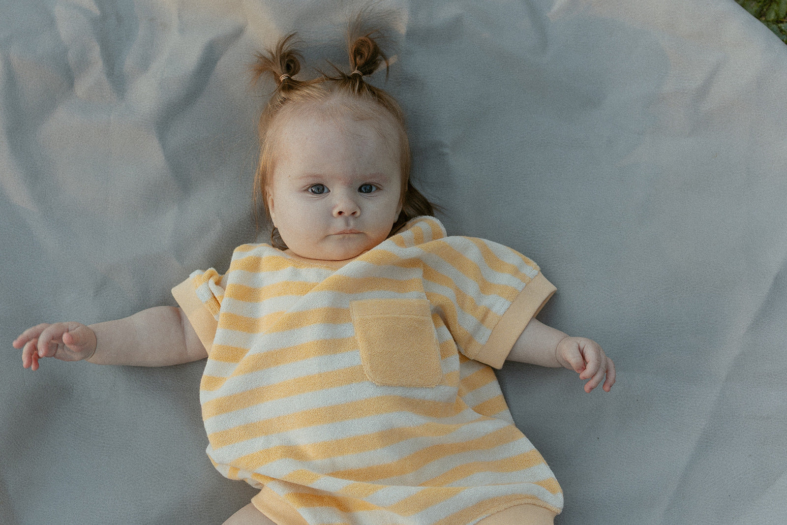 The Callie Romper is the perfect companion for little ones who love to move and play. Crafted from soft terry cloth with a charming striped pattern, this oversized romper offers the comfort and freedom babies and young toddlers need for playtime, naptime, and everything in between. The relaxed, loose fit makes it ideal for spring and summer adventures—whether your little one is exploring at home, enjoying a family vacation, or simply being their playful, fun self. Easy to slip on and built for comfort, this romper keeps up with active days while looking adorable.