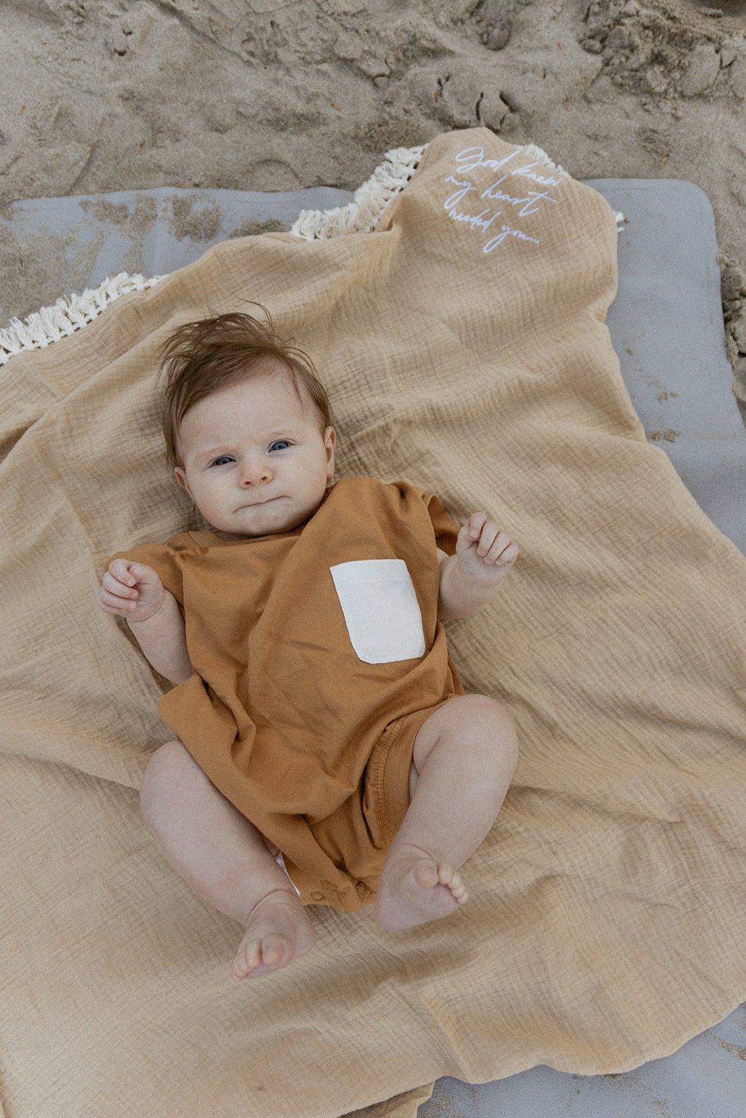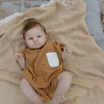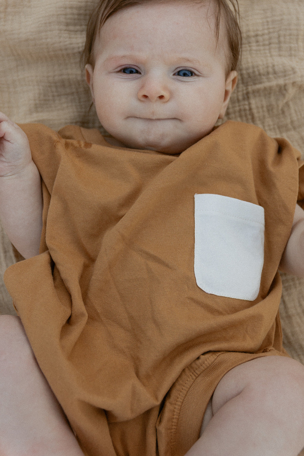 The Cory Pocket Romper is a super soft, short-sleeved cotton romper designed with your little one's comfort in mind. The breathable cotton fabric ensures your baby stays cool and comfy, while the easy snap closures make diaper changes a breeze.