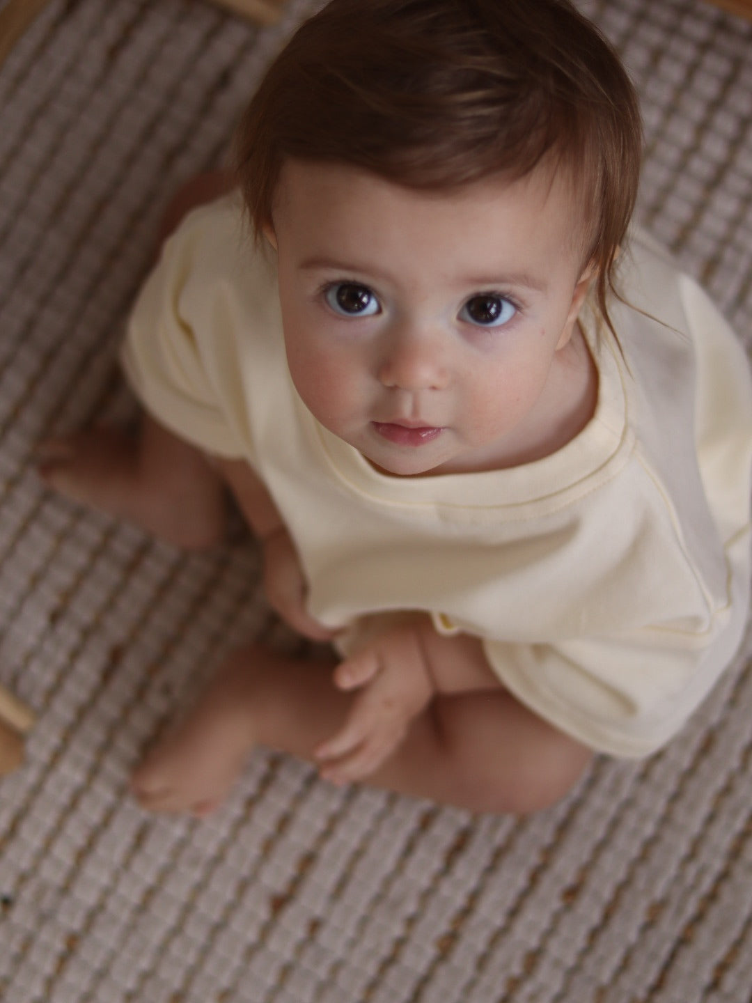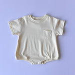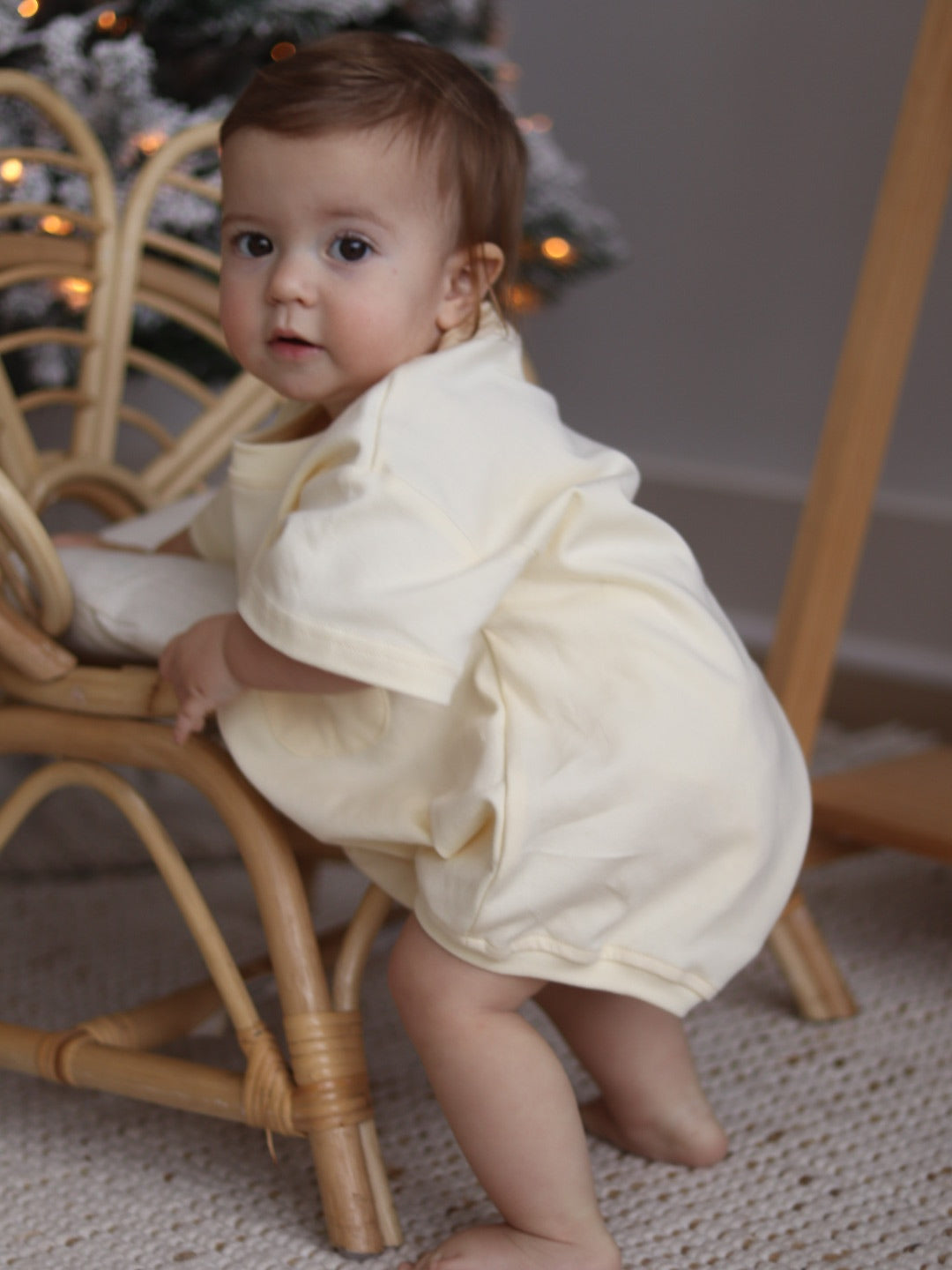 It's our most popular romper, the Cory Pocket Romper. Made with a soft and comfortable fabric, this oversize fit romper is a favorite among parents for its easy snap closure and loose fit for babies and toddlers. Perfect for girls and boys, with a stylish pocket detail. Everyone will ask you where you go this romper.