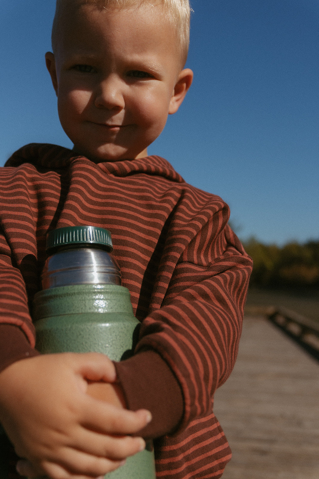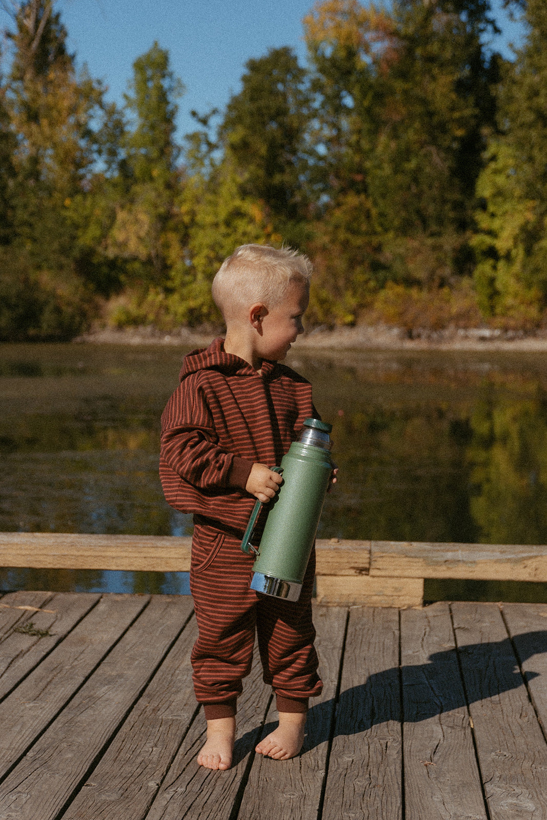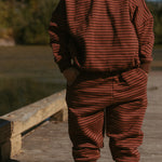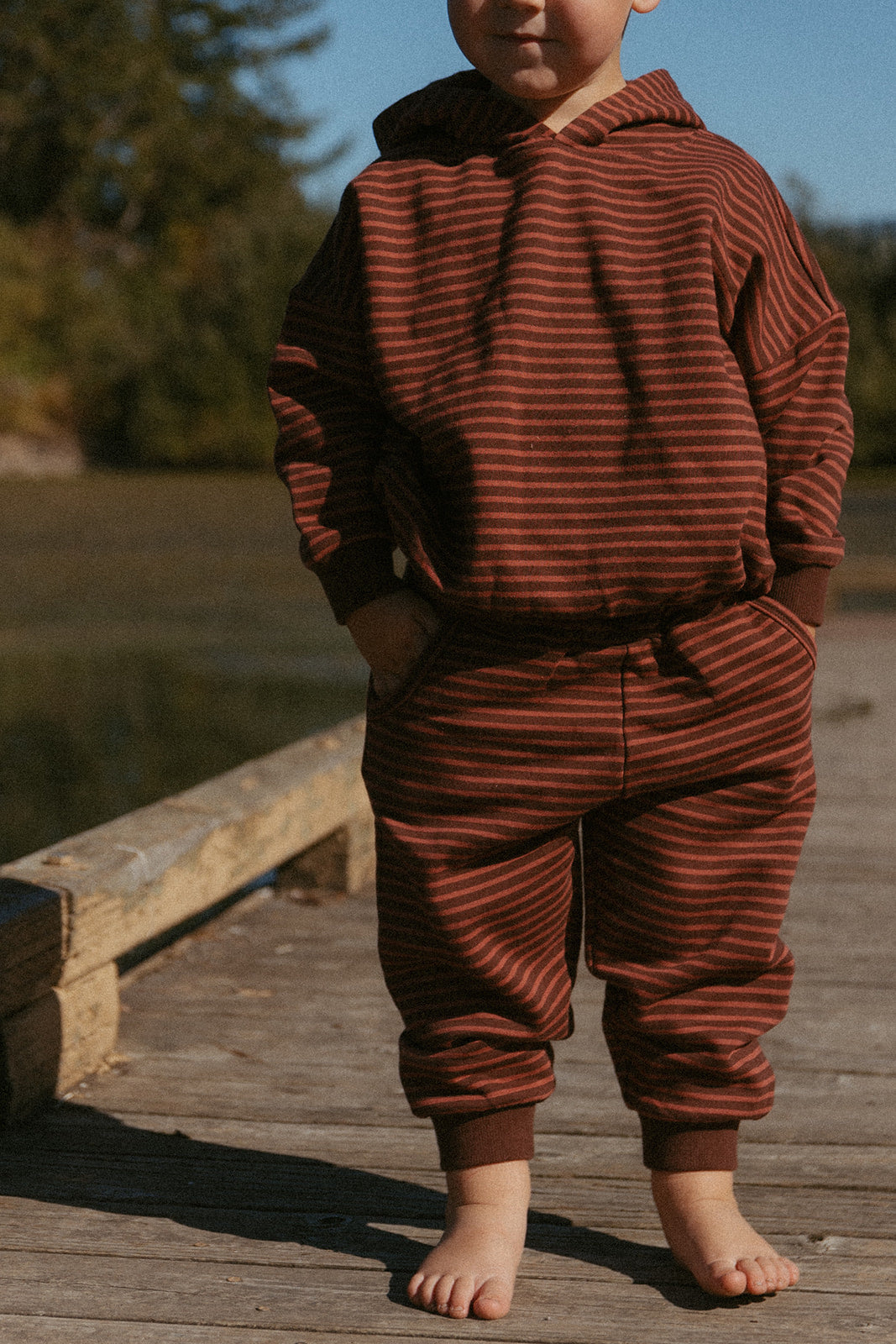 Dress your baby and toddler in the Jamie Set in Thin Bitter Chocolate Stripe for cozy, playful days! Made from soft brushed-back French terry fabric, this oversized hooded sweatshirt and drawstring pants combo keeps little ones comfy and free to move. Perfect for naps, playtime, or family adventures!