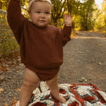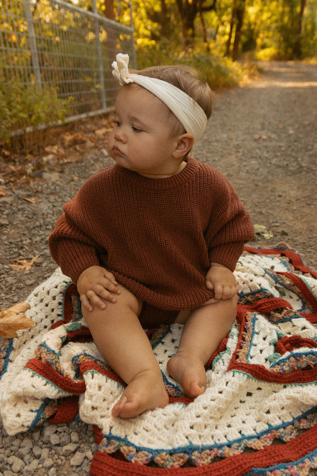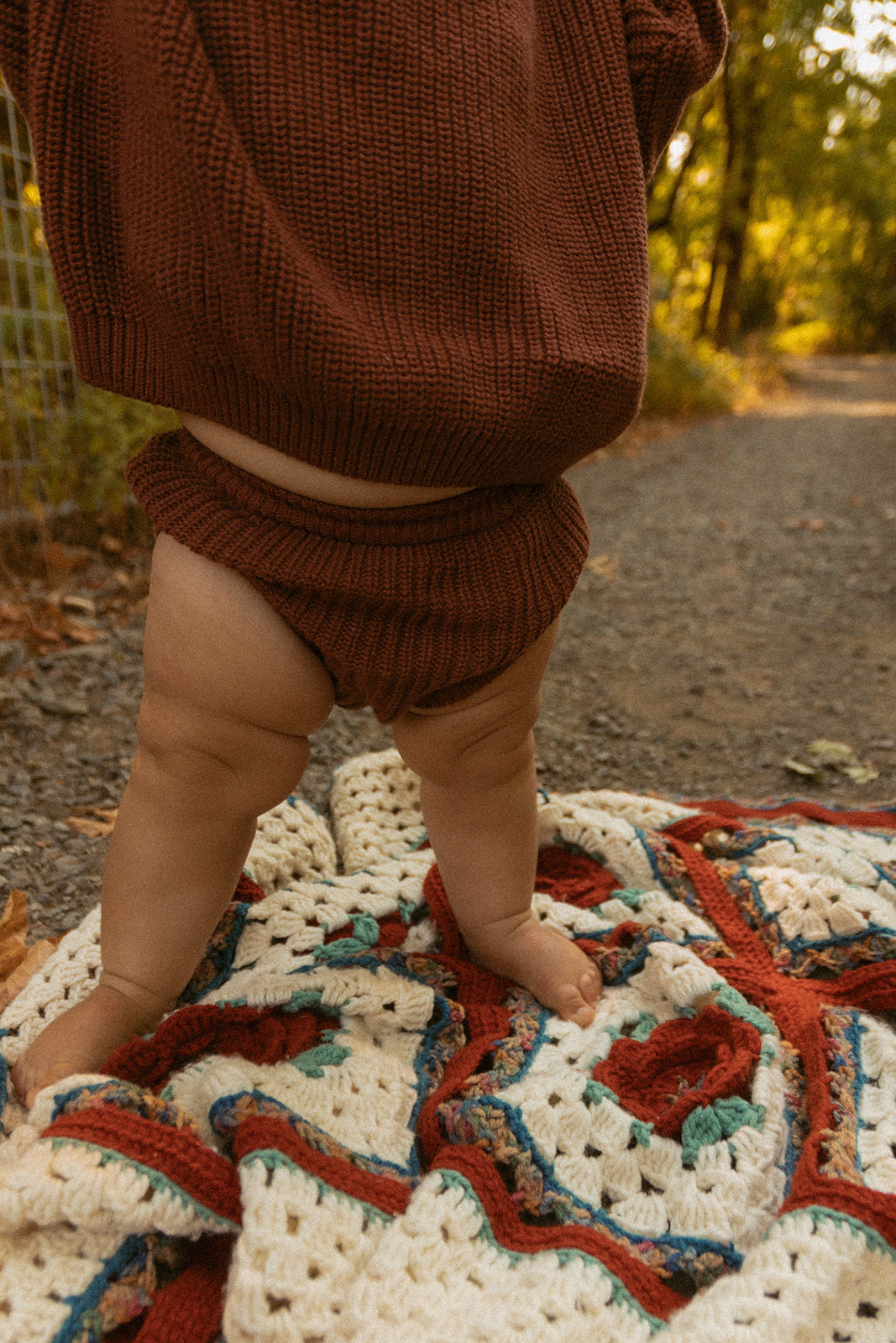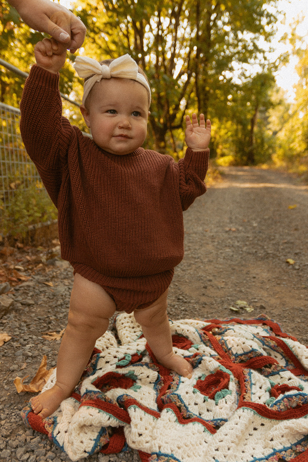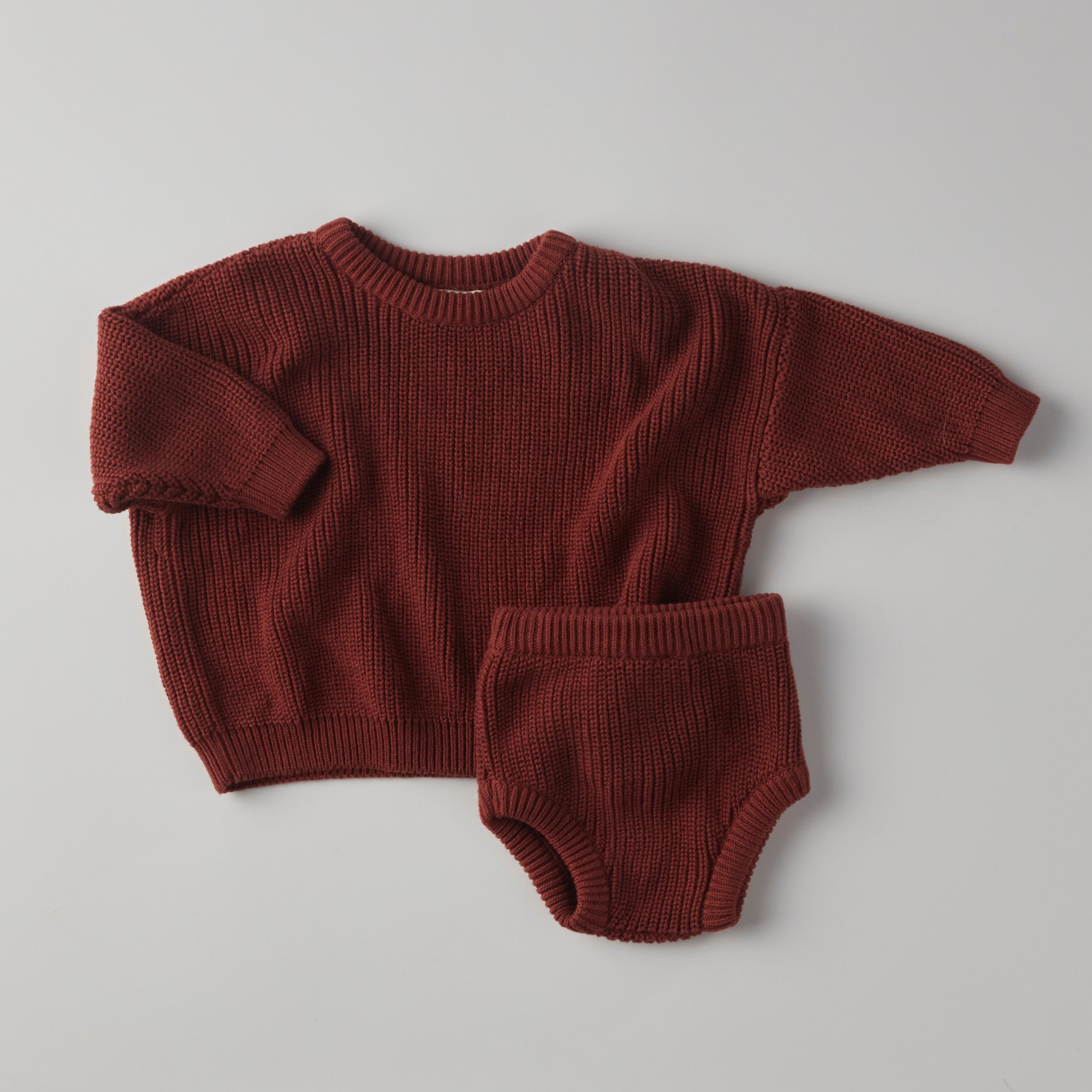 The Jesse Set in Henna offers a cozy and stylish two-piece look with an oversized chunky knit sweater and comfortable bloomer bottoms. Designed to keep your little ones warm and cozy!