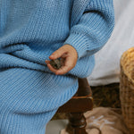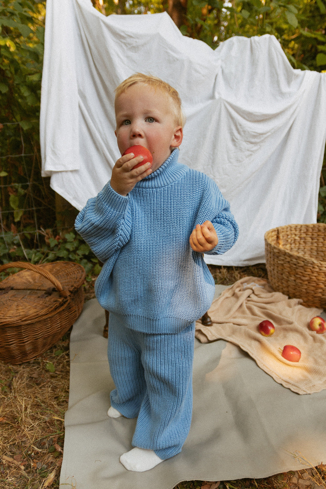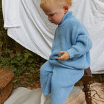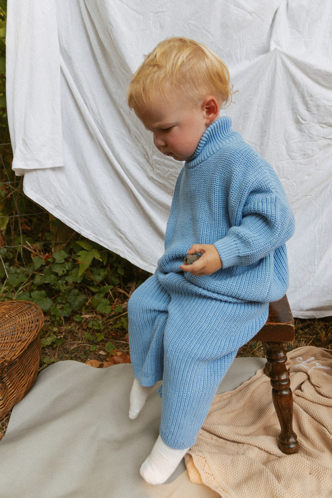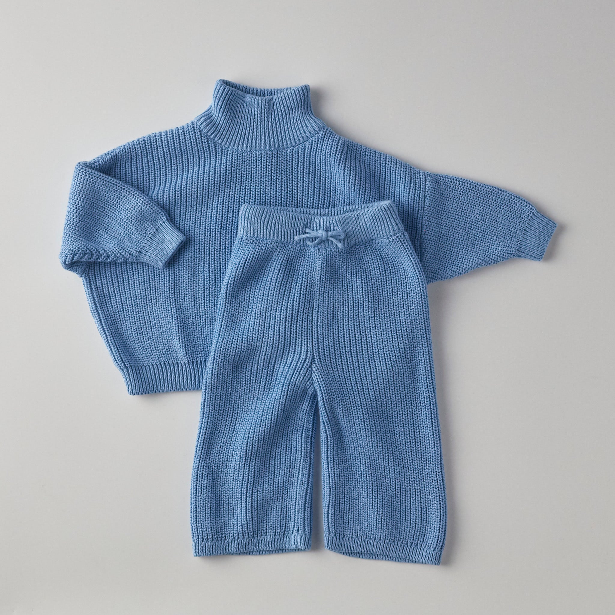Cozy up in the Morgan Set in Bel Air Blue, featuring a playful oversized mock neck sweater paired with wide-leg pants. This knit two-piece offers effortless comfort and style, perfect for lounging or playing!