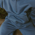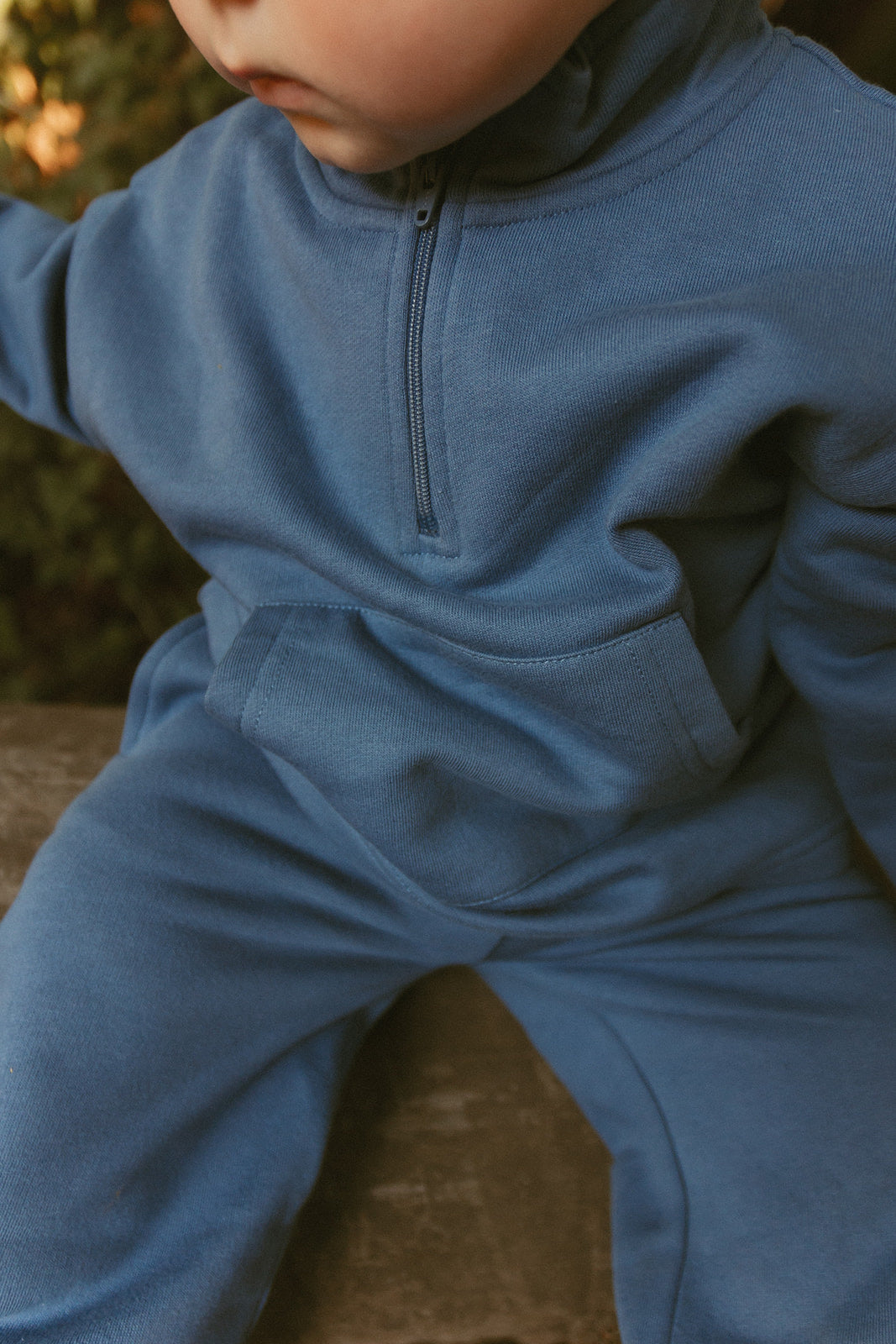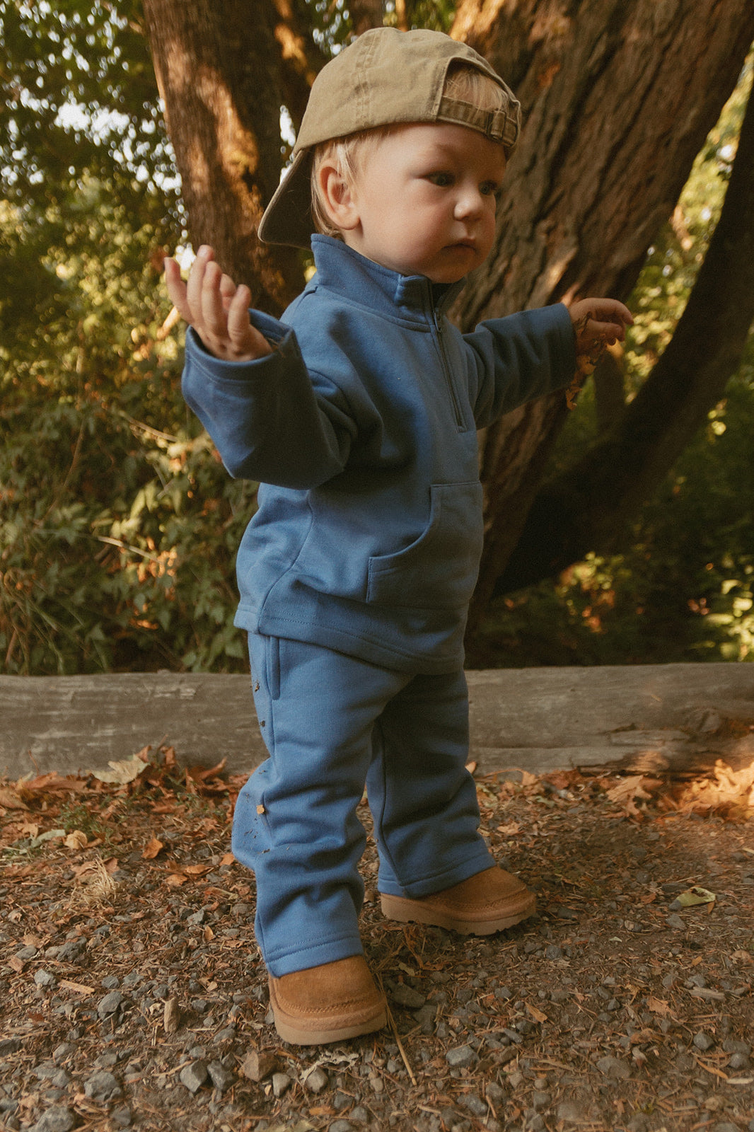 The Sidney Set in Bijou Blue offers cozy comfort with its brushed-back french terry fabric. Featuring a relaxed wide-leg pant and a quarter-zip top, it is perfect for lounging or casual days!