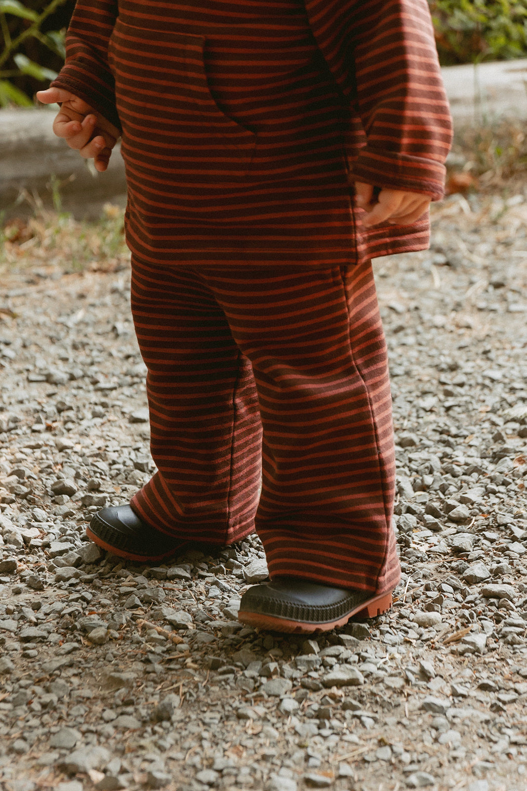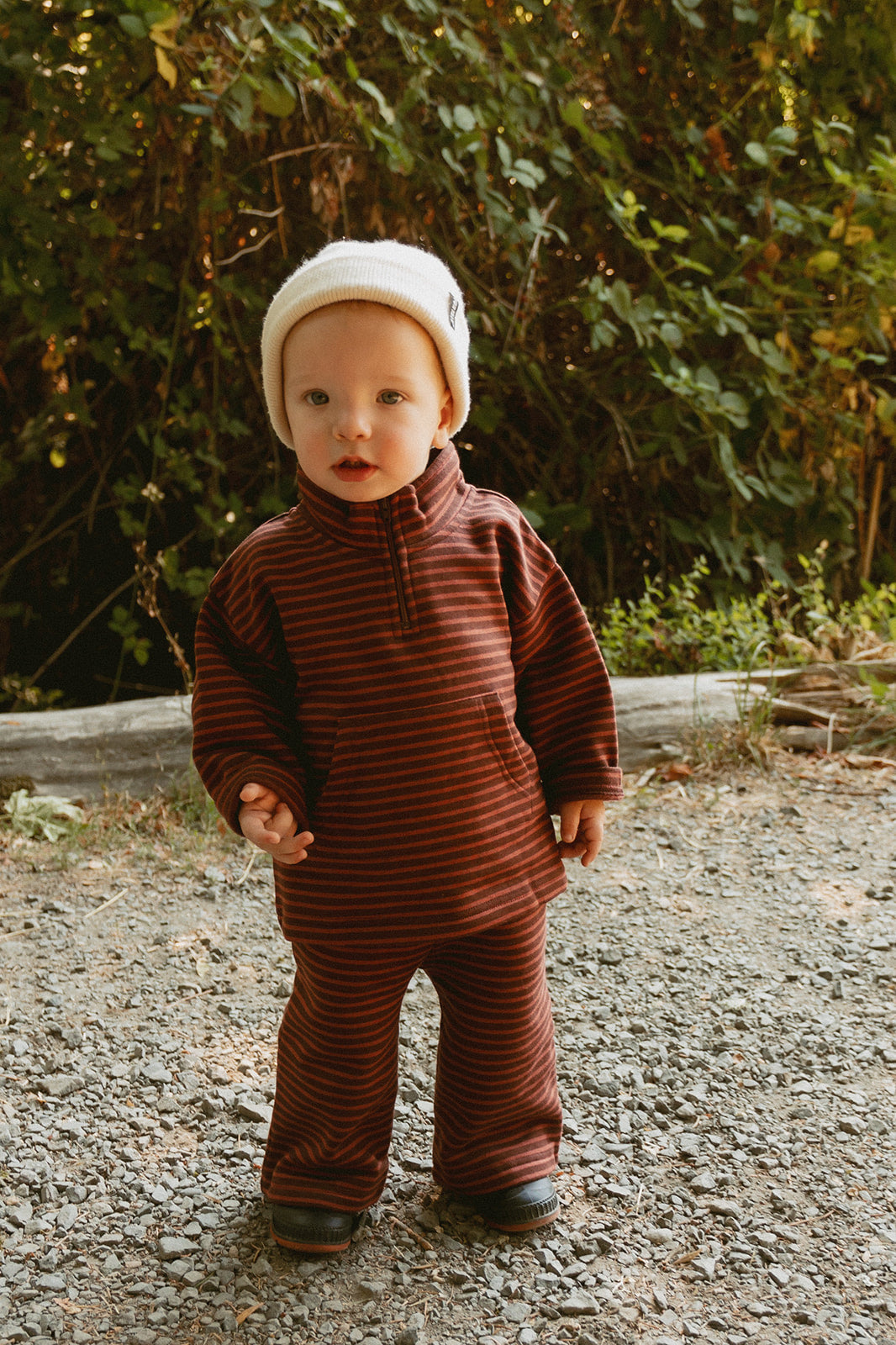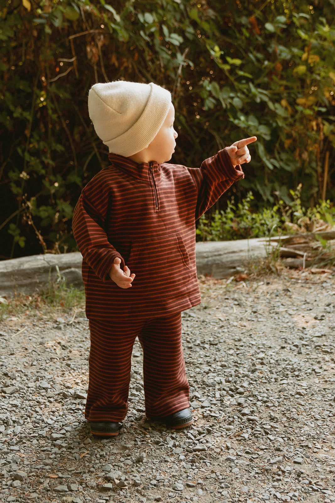 The Sidney Set in Thin Bitter Chocolate Stripe offers cozy comfort with its brushed-back french terry fabric. Featuring a relaxed wide-leg pant and a quarter-zip top, it is perfect for lounging or casual days!