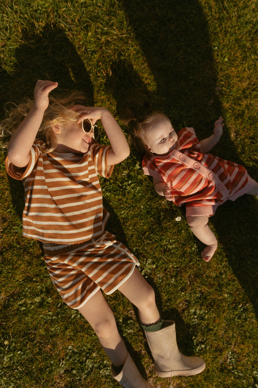 The Sterling Set brings effortless style to playtime and beyond. This two-piece terry cloth outfit features a soft, striped shirt paired with comfortable shorts—perfect for babies and toddlers who love to move. The retro-inspired design and cheerful apple cinnamon palette make it ideal for spring and summer adventures, whether heading to preschool, traveling, or enjoying outdoor fun. Durable terry cloth keeps little ones cozy while the playful stripes add personality to any day.