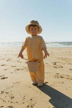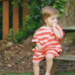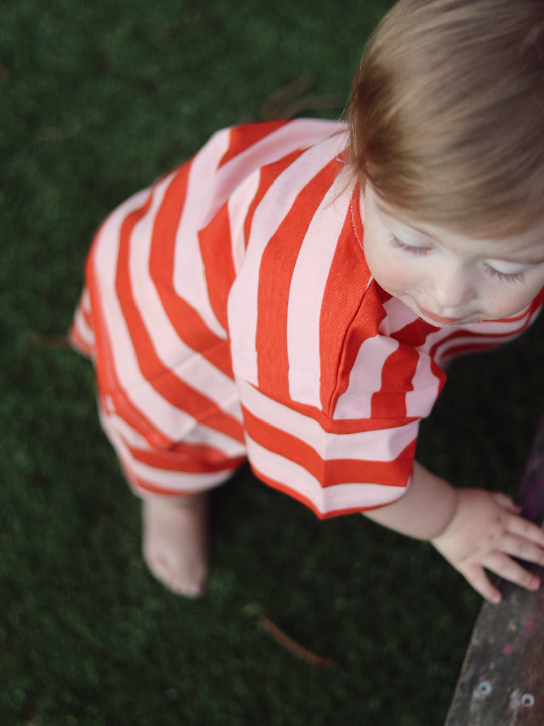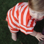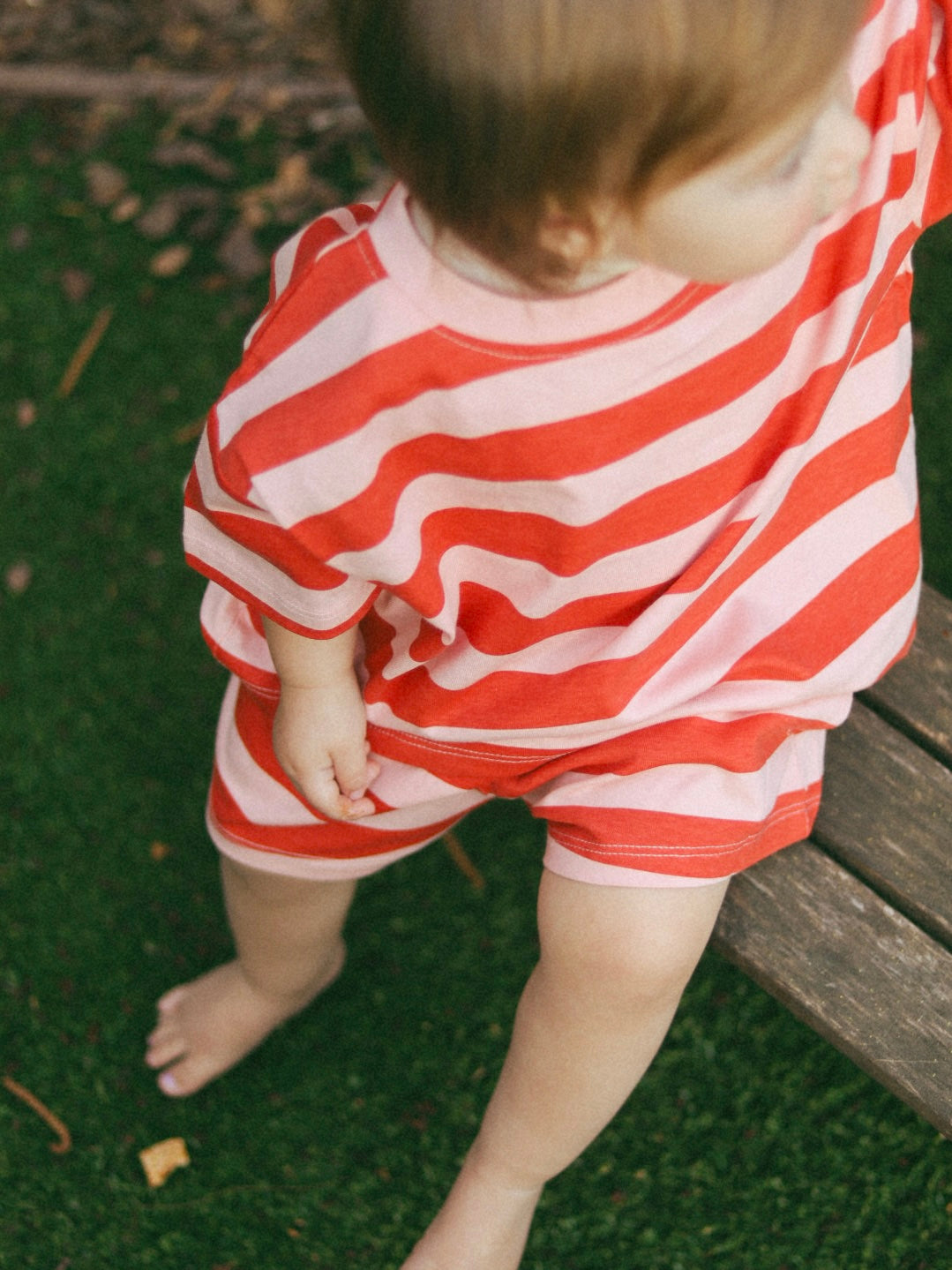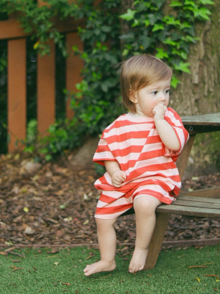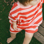 Brighten your little one's wardrobe with the Toby Set. This cheerful two-piece features a vibrant striped pattern in warm, inviting tones that's perfect for playtime, preschool, and everything in between. Crafted from 100% cotton, the oversized cut ensures comfort and room to grow, making it ideal for active babies and toddlers during spring and summer months. Whether they're exploring the playground or enjoying quiet time at home, this set keeps them cool, comfortable, and ready for fun.